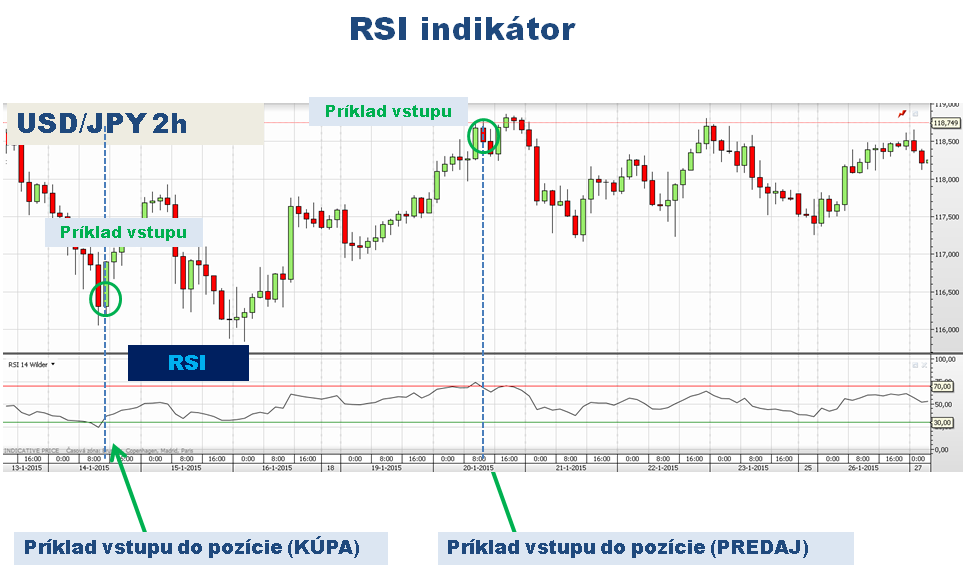 Ako funguje trading s RSI, je znázornené na nasledovnom H2 grafe USD/JPY.