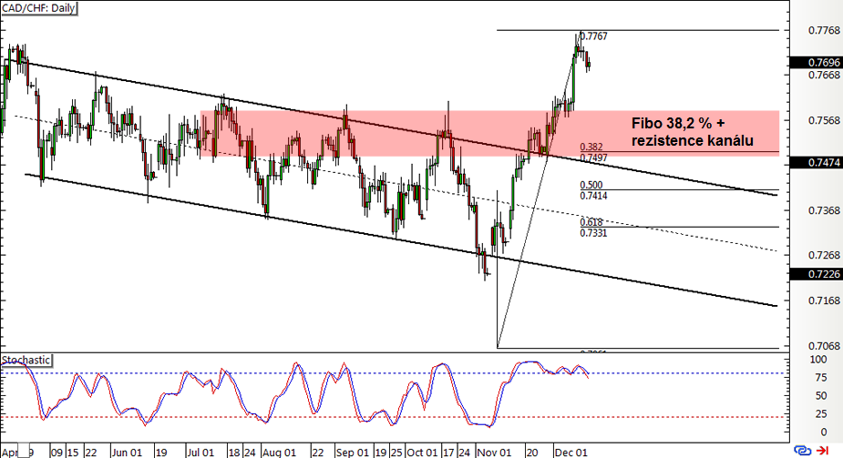 Měnový pár CAD/CHF se na denním grafu obchodoval v dlouhodobém klesajícím trendovém kanálu, nicméně koncem listopadu prolomil rezistenci tohoto kanálu a posílil na hladinu 0,7767. Aktuálně to vypadá, že bychom se mohli dočkat korekce zpět (throwback) k této prolomené rezistenci trendového kanálu, která koresponduje s psychologickou hladinou 0,7500 a úrovní 38,2 % Fibonacciho retracementu. Indikátor Stochastic se nachází v překoupené oblasti a to značí možný nástup medvědů. Dočkáme se korekce měnového páru směrem ke zmíněné S/R oblasti a následného odrazu zpět k vyšším hodnotám?