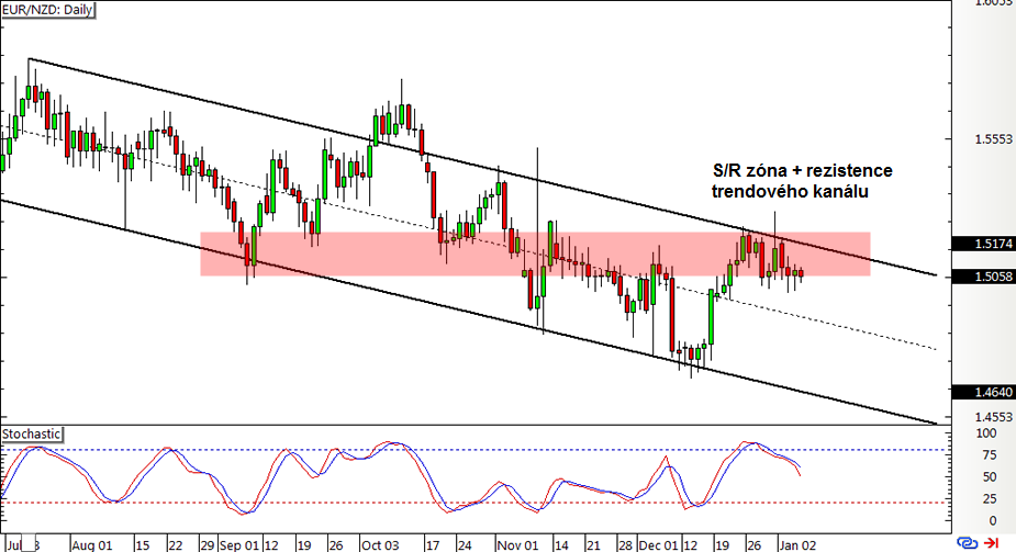 Měnový pár EUR/NZD se na denním grafu obchoduje v dlouhodobém klesajícím trendovém kanálu a momentálně se nachází v blízkosti rezistence tohoto trendového kanálu, která koresponduje s klíčovou oblastí S/R zóny. Indikátor Stochastic zároveň míří směrem dolů, což značí převahu medvědů.