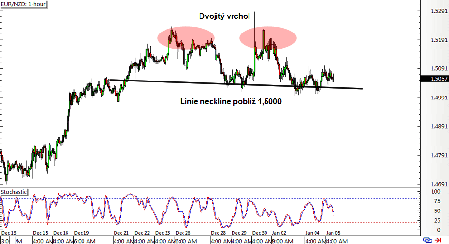 Při pohledu na 1hodinový graf utvořil EUR/NZD formaci dvojitý vrchol a aktuálně se nachází poblíž linie neckline této formace, která koresponduje s klíčovou psychologickou hladinou 1,5000. Pokud měnový pár dokáže prolomit směrem dolů linii neckline, mohl by následovat pokles k nižším hodnotám.