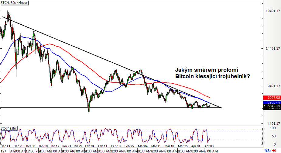 Kryptoměna Bitcoin na 4hodinovém grafu aktuálně testuje rezistenci symetrického trojúhelníku. Nyní bude důležité, jakým směrem cena tuto formaci prorazí a tím dojde k zahájení nového krátkodobého trendu. Dojde tedy k průrazu zmiňované rezistence, nebo se naopak dočkáme odrazu a následného poklesu zpět směrem k supportu formace? Tomu nasvědčuje i indikátor Stochastic, který signalizuje překoupené podmínky, další růst tak může být limitován. -