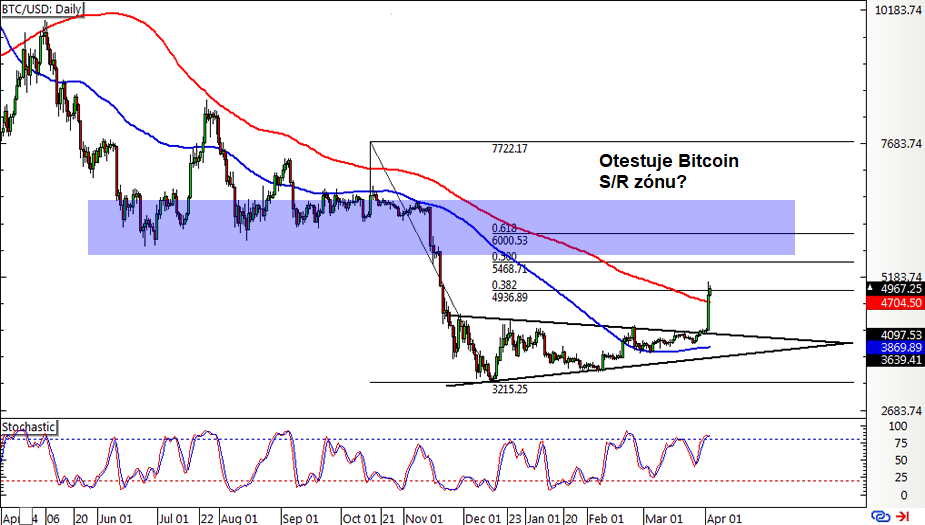 Cena Bitcoinu na denním grafu prolomila směrem vzhůru rezistenci symetrického trojúhelníku a nyní testuje úroveň 38,2 % Fibonacciho retracementu. Dočkáme se pokračování růstu směrem k vyznačené S/R zóně, která koresponduje s úrovní 61,8 % Fibonacciho retracementu? Indikátor Stochastic již ale signalizuje překoupené podmínky, další růst tak může být limitován.