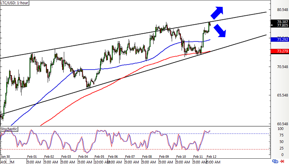 Cena Litecoinu na 1hodinovém grafu aktuálně proráží směrem vzhůru rezistenci rostoucího trendového kanálu. Nicméně, indikátor Stochastic již signalizuje překoupené podmínky, což značí možnou vyčerpanost býků, a tedy možný falešný průraz. Vrátí se tak cena zpět do trendového kanálu? -