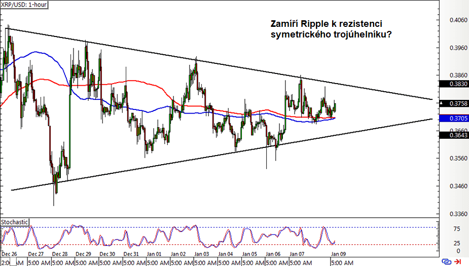 Cena Ripplu se na 1hodinovém grafu obchoduje v symetrickém trojúhelníku. Indikátor Stochastic zatím nezasáhl přeprodanou oblast, ale již se otáčí směrem vzhůru. Dostanou se tak ke slovu spíše býci a zamíří cena této kryptoměny směrem k rezistenci trojúhelníku?