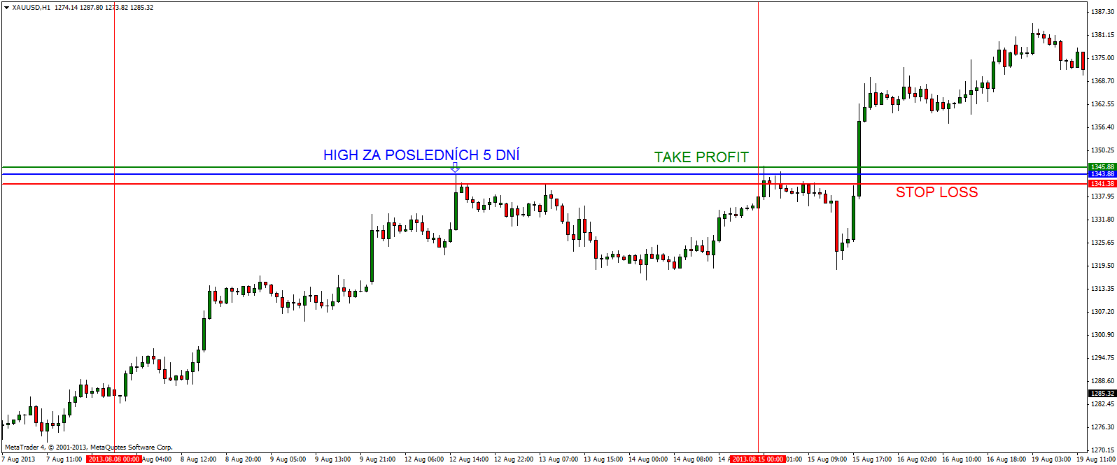 Vysvětleme si nyní princip, na kterém tento automatický obchodní systém pracuje. AOS zadává přesně o půlnoci londýnského času dva čekající pokyny. Konkrétně příkaz buy-stop na úrovni cenového maxima za pět posledních dní a na opačné straně příkaz sell-stop na úrovni cenového minima za pět posledních dní. Strategie je tedy založena na průrazu silných cenových úrovní – supportu a rezistence.