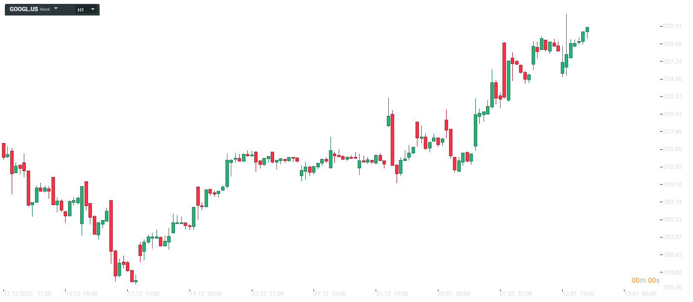 Vývoj ceny akcií Alphabet (1hodinový graf - H1):
