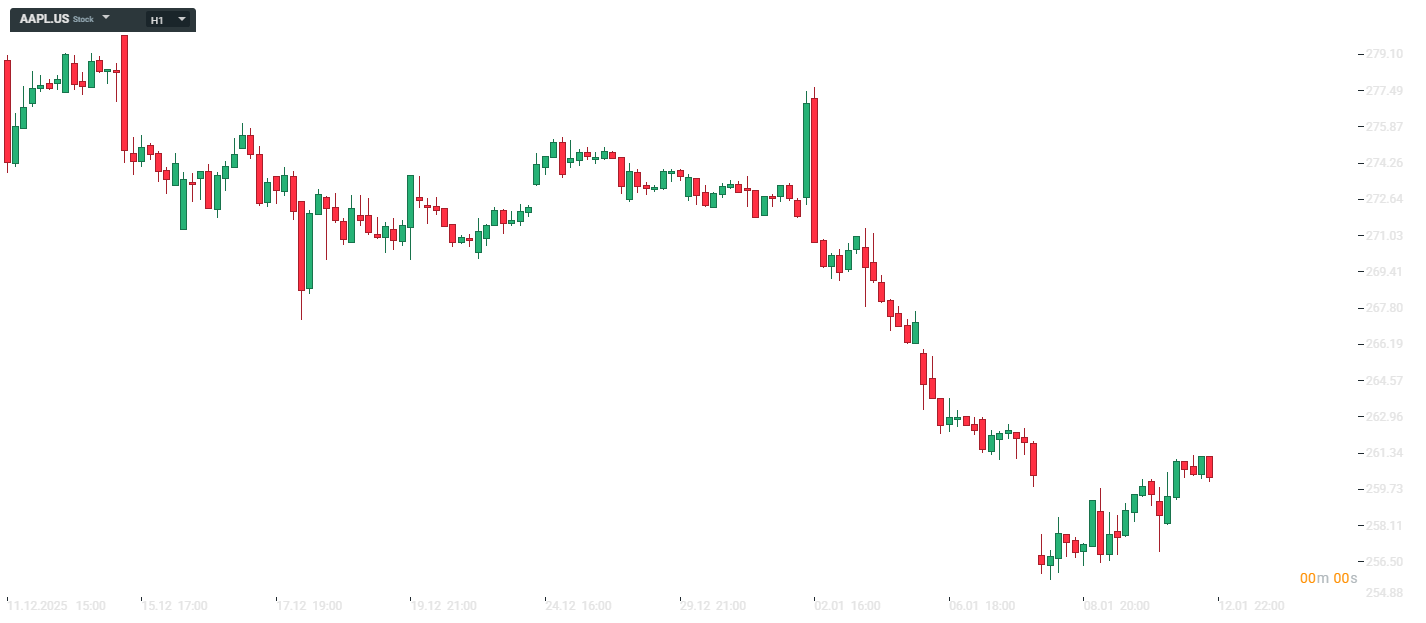 Vývoj ceny akcií Apple (1hodinový graf - H1):