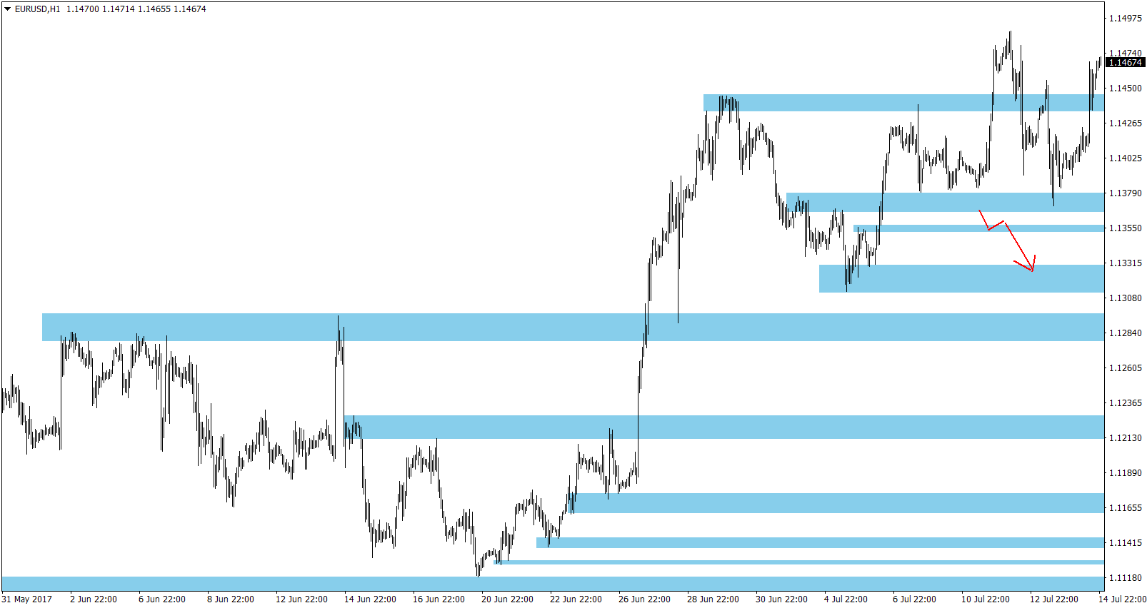 Nastavení mých S/R úrovní na měnovém páru EUR/USD (1hodinový graf – H1):