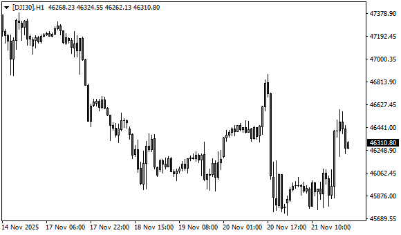 Vývoj akciového indexu Dow Jones (1hodinový graf – H1):