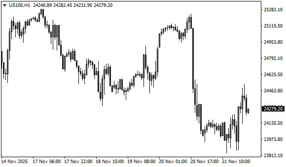 Vývoj akciového indexu NASDAQ 100 (1hodinový graf – H1):