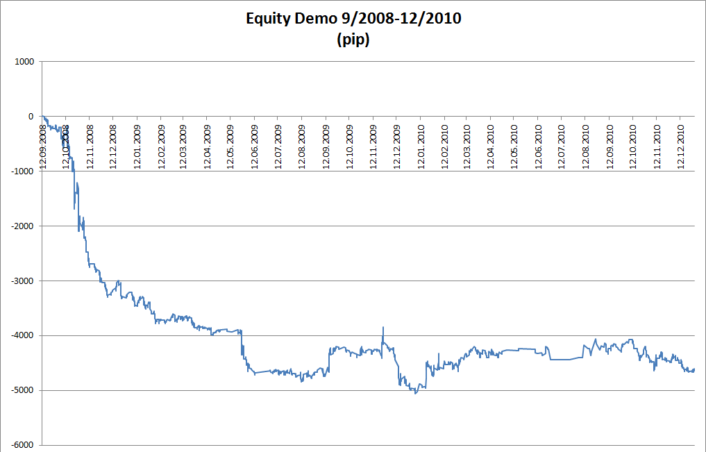 Musím říci, že více jsem se věnoval Fullerovi, byť je jeho způsob vyjadřování pro moji úroveň angličtiny obtížný. Líbila se mi však zdánlivá jednoduchost „signálů“ – pin bary, inside bary apod. Hned jsem začal aplikovat získané poznatky v praxi. A výsledky se dostavily téměř okamžitě - leden 2010 jsem zakončil se ziskem 360 pipů! Byl to pro mne fantastický výsledek!! Po roce a čtvrt jsem skončil v zisku a to téměř dvojnásobném oproti plánu (200 pipů)!!!. Únor byl slabší, zisk jen 19 pipů. Trochu jsem znejistěl. Ale březen byl opět úspěšný – zisk téměř 260 pipů. Začal jsem uvažovat o přechodu na reálný účet.