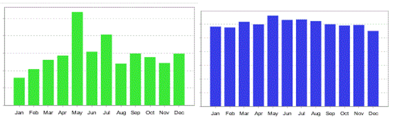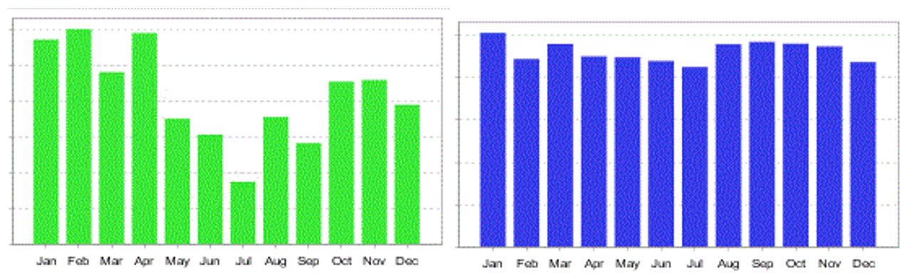 Z backtestu vidíte (vlevo vždy rozložení zisků, vpravo vždy počet obchodů), že prázdniny jsou vcelku průměrné měsíce, na počty obchodů taky průměr.