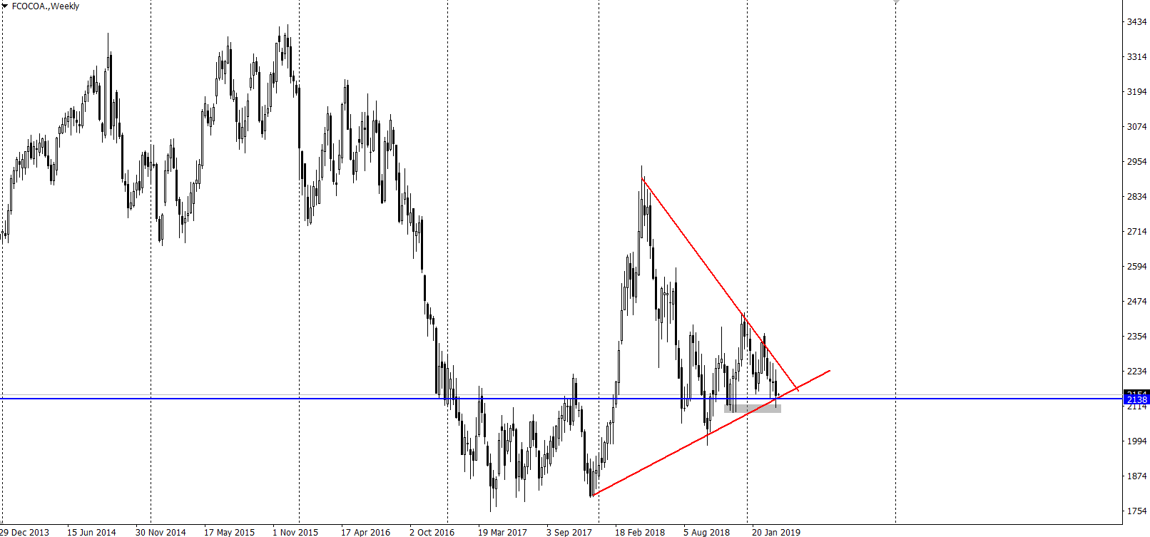 Při spojení denního a týdenního grafu je zřejmé, že kakao nyní osciluje ve vyvážené oblasti s tendencí k tvorbě trianglu. Triangl informuje tradery, že daná komodita odmítá nižší low a vyšší high a připravuje se na potenciální trendové období.