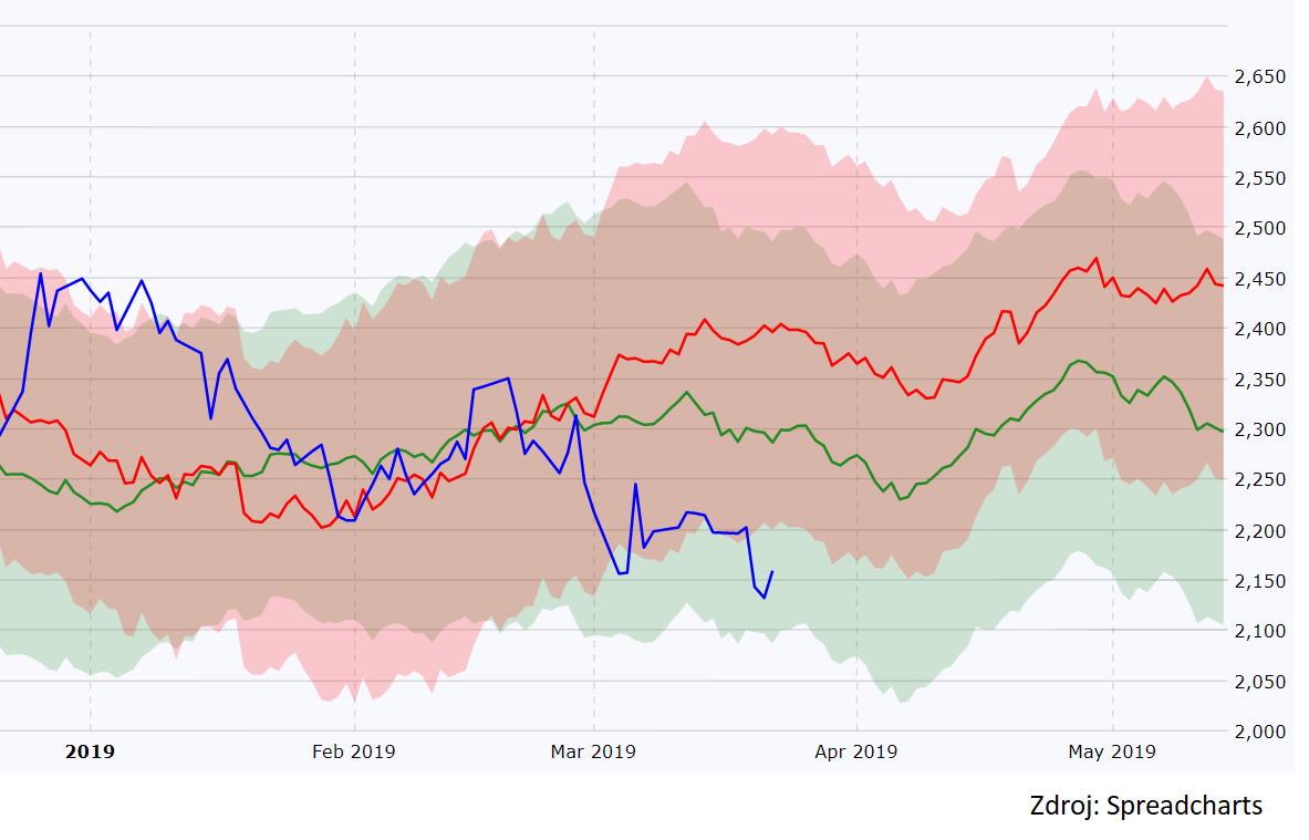 Kakao (aktuální kontrakt – modrá linka) je vzhledem k 5 a 15letým průměrům podhodnocené. Dle sezónních průměrů má před sebou zároveň silné období až do 30. 4. 2019, ve kterém v posledních letech obvykle posilovalo.