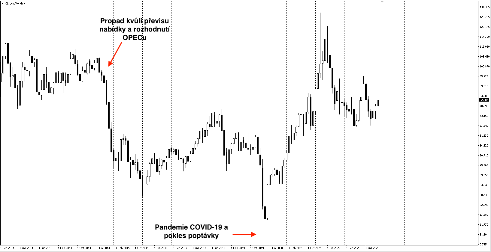 1) Období kolem roku 2014-2015: Zde vidíme výrazný propad ceny ropy, což bylo způsobeno převisem nabídky na trhu, částečně v důsledku amerického břidlicového boomu, který vedl k větší produkci ropy v USA. Tento pokles byl také umocněn OPECem, který se rozhodl neomezit produkci s cílem udržet svůj tržní podíl.