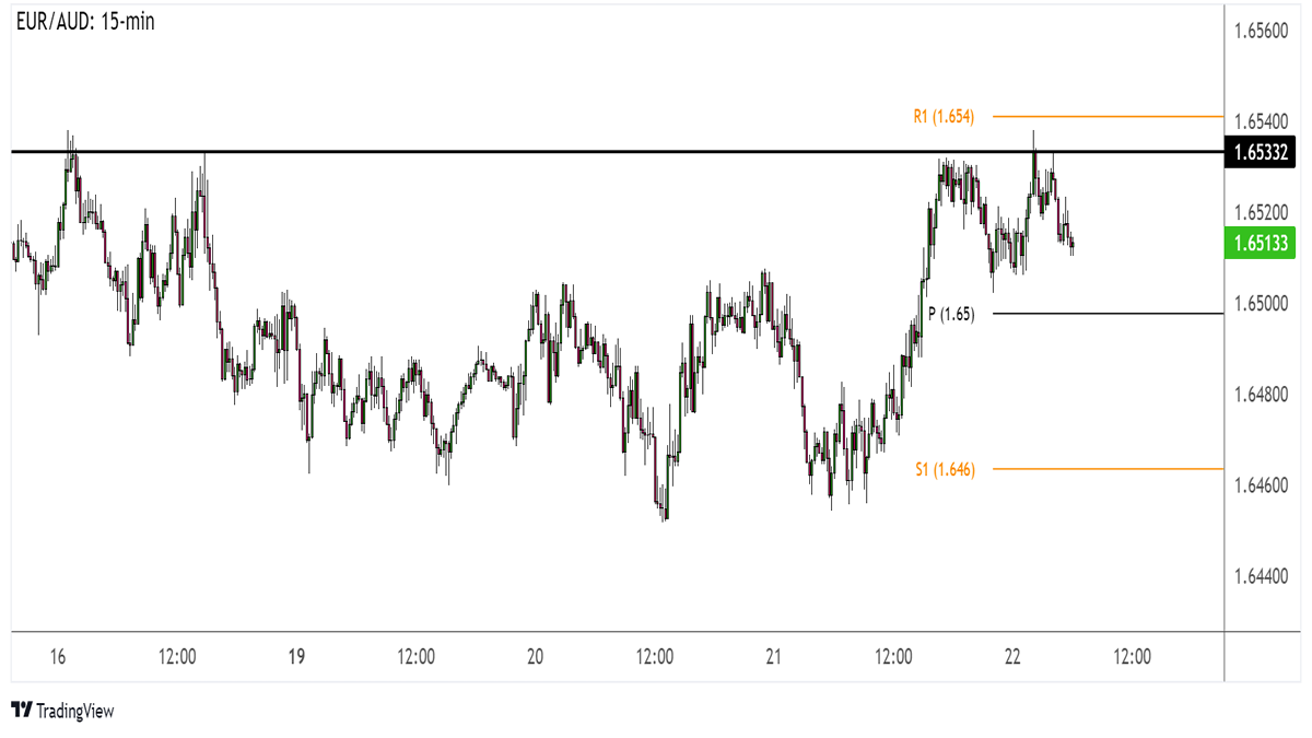Měnový pár EUR/AUD se na 15minutovém grafu aktuálně odráží směrem dolů od vyznačené rezistence kolem hladiny 1,6535. Bude tento měnový pár pokračovat v oslabování a dočkáme se otestování úrovně standartního Pivot Pointu S1? Nebo kolem současných úrovní najdou znovu sílu býci a dojde k prolomení rezistence a otestování úrovně R1?