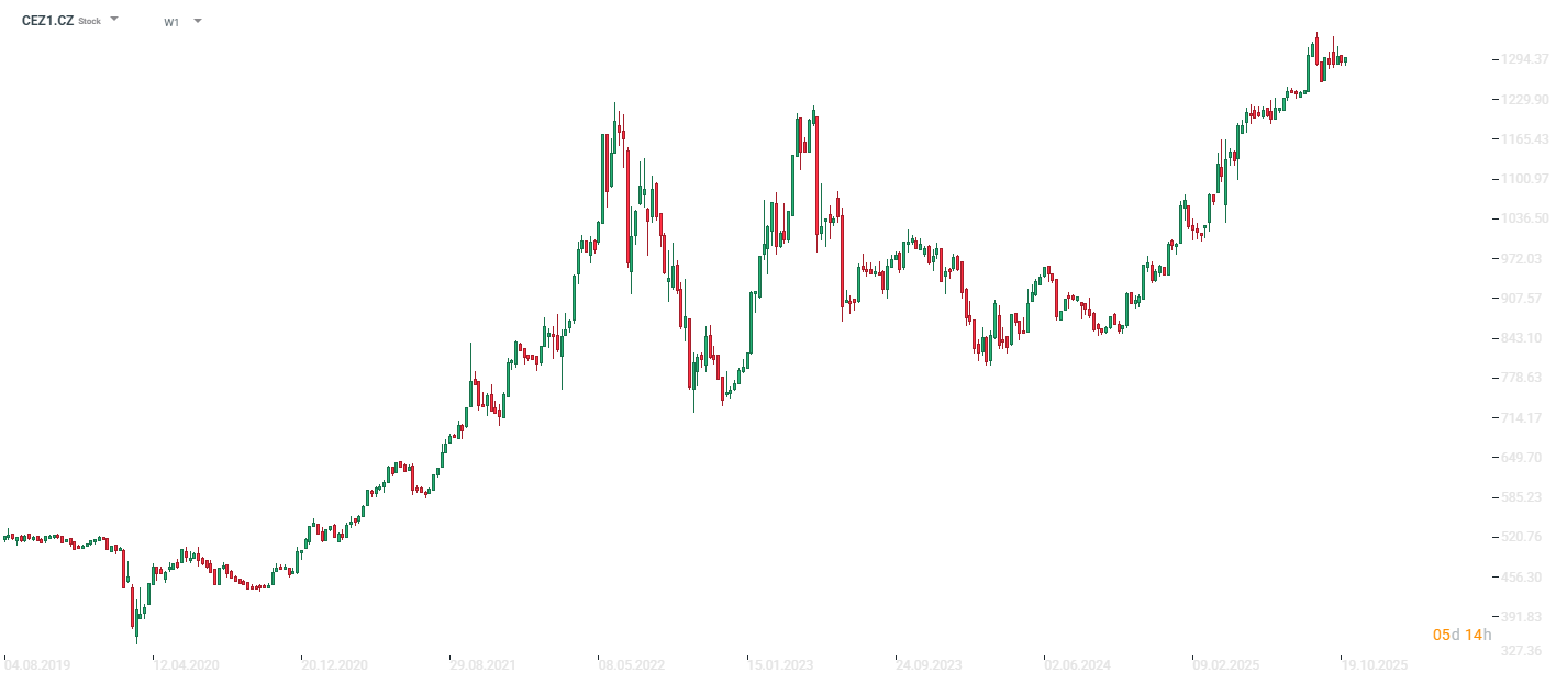 Vývoj ceny akcií ČEZ (týdenní graf – W1):