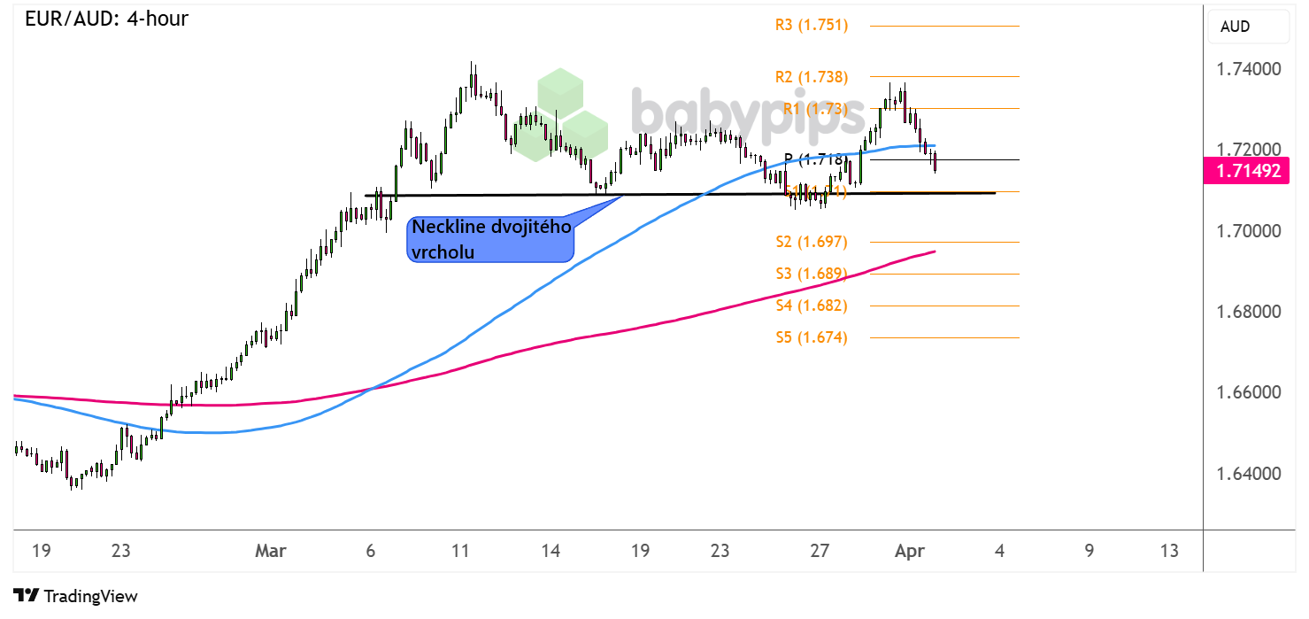 Klíčová slova: EUR/AUD | Měnový pár | Neckline | EUR | AUD | Babypips | Graf | Vývoj měnového páru | TradingView | Dvojitý vrchol | Vývoj | Pokračování rostoucího trendu | Linie neckline | Oslabení |