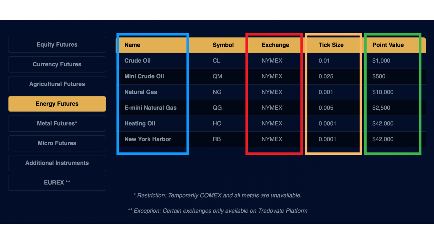 Konkrétní seznam všech komodit, které prop firma nabízí, je k dispozici na webových stránkách dané prop firmy. Například Apex Trader Funding to má velmi přehledně vypsáno.