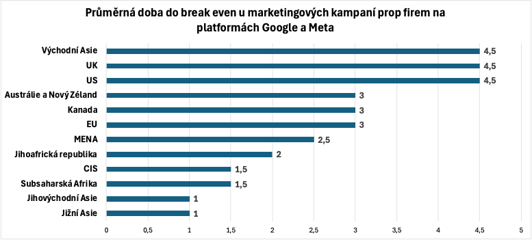 Když se na to podíváme jako na čistě marketingovou návratnost kampaní na Google a Meta, tak průměrný čas do break even, což je bod zvratu, kdy se zisk rovná nákladům v tomto případě na marketing, se podle regionu zásadně liší, a právě to často rozhoduje, kam se prop firmám vyplatí expandovat. Z dostupných dat vychází nejrychleji Jižní Asie a Jihovýchodní Asie, kde se prop firmy běžně dostanou na break even už zhruba za 1 měsíc, přičemž Jižní Asie je zároveň trh, kde může špičkový ROAS (návratnost výdajů na reklamu, například utratíte 1 000 Kč za reklamu a tato útrata přinese 3 000 Kč tržeb, ROAS = 3, tedy 3x.) dosahovat až 12násobku. Následuje Subsaharská Afrika a region CIS, kde časový průměr vychází okolo 1.5 měsíce, potom Jihoafrická republika zhruba 2 měsíce a region MENA přibližně 2.5 měsíce. Evropská unie se pohybuje okolo 3 měsíců, podobně jako Kanada a také Austrálie a Nový Zéland. Naopak nejdelší návratnost vychází v nejkonkurenčnějších a nejvyspělejších trzích, tedy v USA, v UK a ve vyspělé Východní Asii, kde průměrně vychází break even kolem 4.5 měsíce. Do toho zapadá i to, že v USA se jako stabilní výkon často uvádí working ROAS (dlouhodobě udržitelný ROAS) až kolem 3násobku, zatímco silné značky se mohou dostat až ke 4násobku, jenže cesta k takové efektivitě typicky trvá déle, protože trh je saturovaný a dražší. Celkově to potvrzuje, že prop trading je marketingově řízený byznys, kde sice organika typu YouTube umí budovat důvěru, ale globálně pořád dominují placené kampaně na Google a Meta a podle země se doplňují i další kanály, například Reddit nebo nativní reklamní sítě.