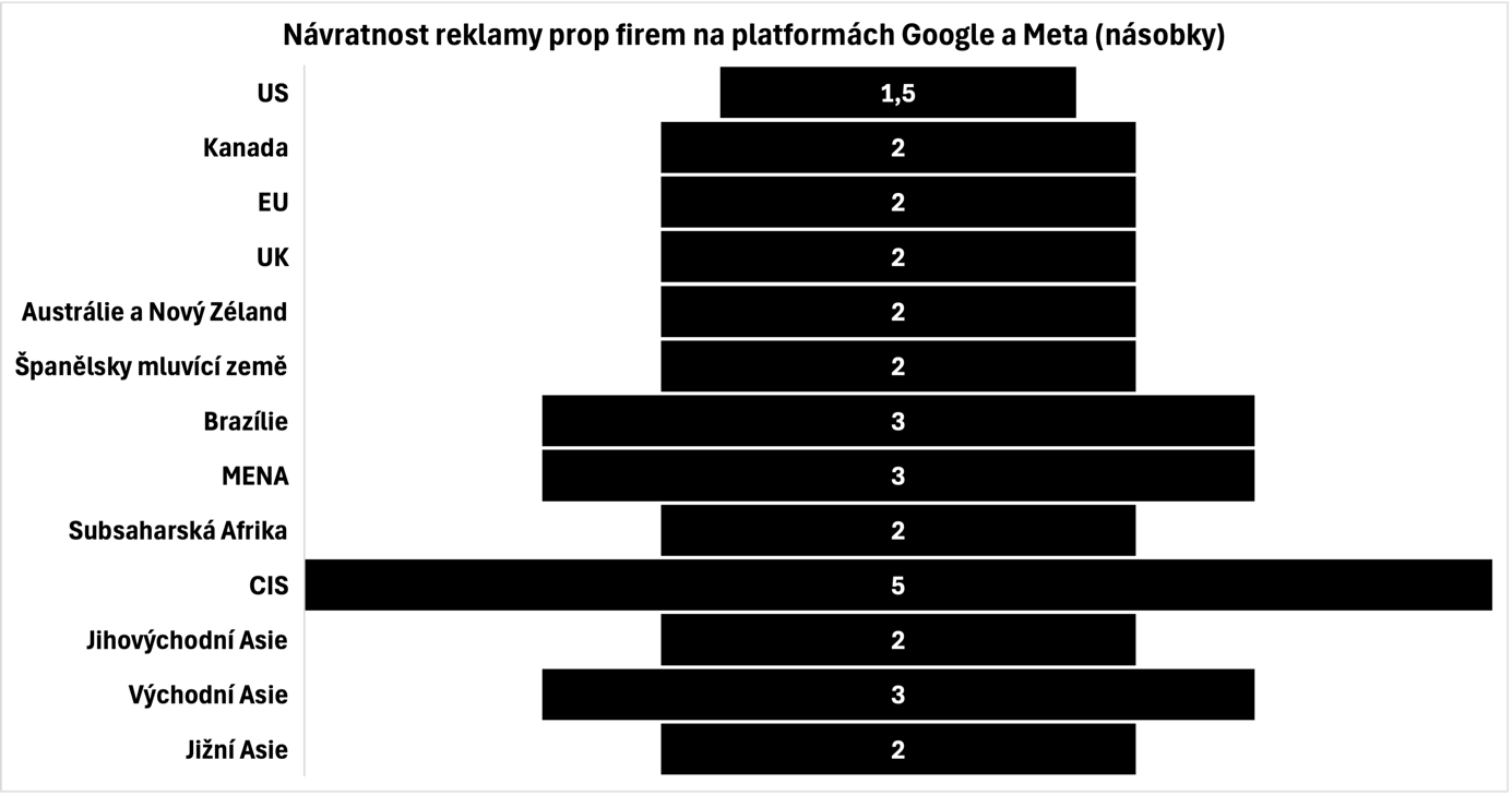 Graf níže ilustruje rozmezí, v jakém se pohybuje návratnost reklamy prop firem v různých regionech, průměrně se drží na hodnotě 1,7násobku.