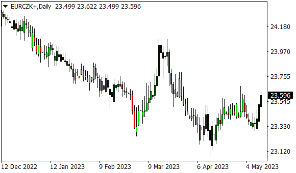 Vývoj měnového páru EUR/CZK (denní graf - D1):