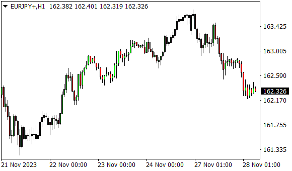 Vývoj měnového páru EUR/JPY (1hodinový graf - H1):