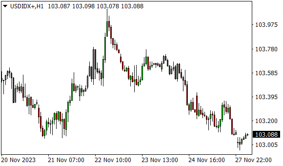 Vývoj dolarového indexu USDX (1hodinový graf - H1):