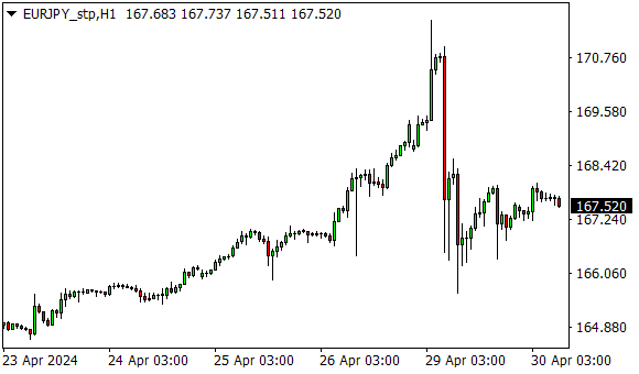 Vývoj měnového páru EUR/JPY (1hodinový graf - H1):