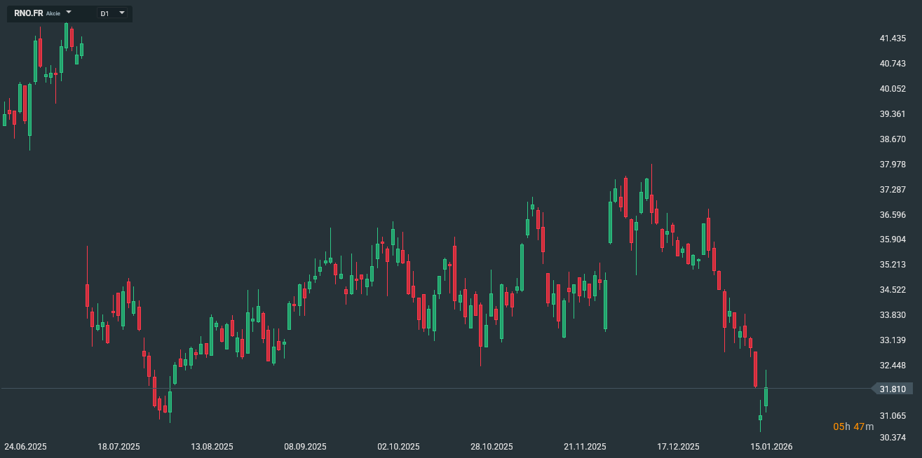 Vývoj akcie Renault (denní graf – D1):