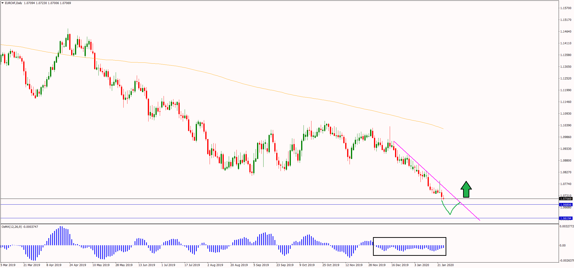Downtrend na EUR/CHF trvá presnejšie 1 a ¾ roka, odkedy sa otočil na úrovni 1.2000. Celkovo mínus 1300 pipov a keď trh príde na level 1.068, dotiahne sa dlho otvorený gap odkiaľ očakávam obrat trendu na minimálne niekoľko mesiacov. Treba si však dať pozor na to, že hneď pod gapom je support, na ktorom môže vzniknúť false break a tým pádom môže ísť trh dole ešte 100 pipov. Po každom trende príde vyvrcholenie, takže treba počkať na ten moment tak ako na libre koncom roka 2019. Ak chcete naozaj konzervatívny vstup, treba si počkať kým sa eurofrank dostane nad trendovú líniu. Značnú prepredanosť potvrdzuje aj OsMA indikátor, takže už si treba len pár dní či týždňov počkať na ten dobrý vstup.