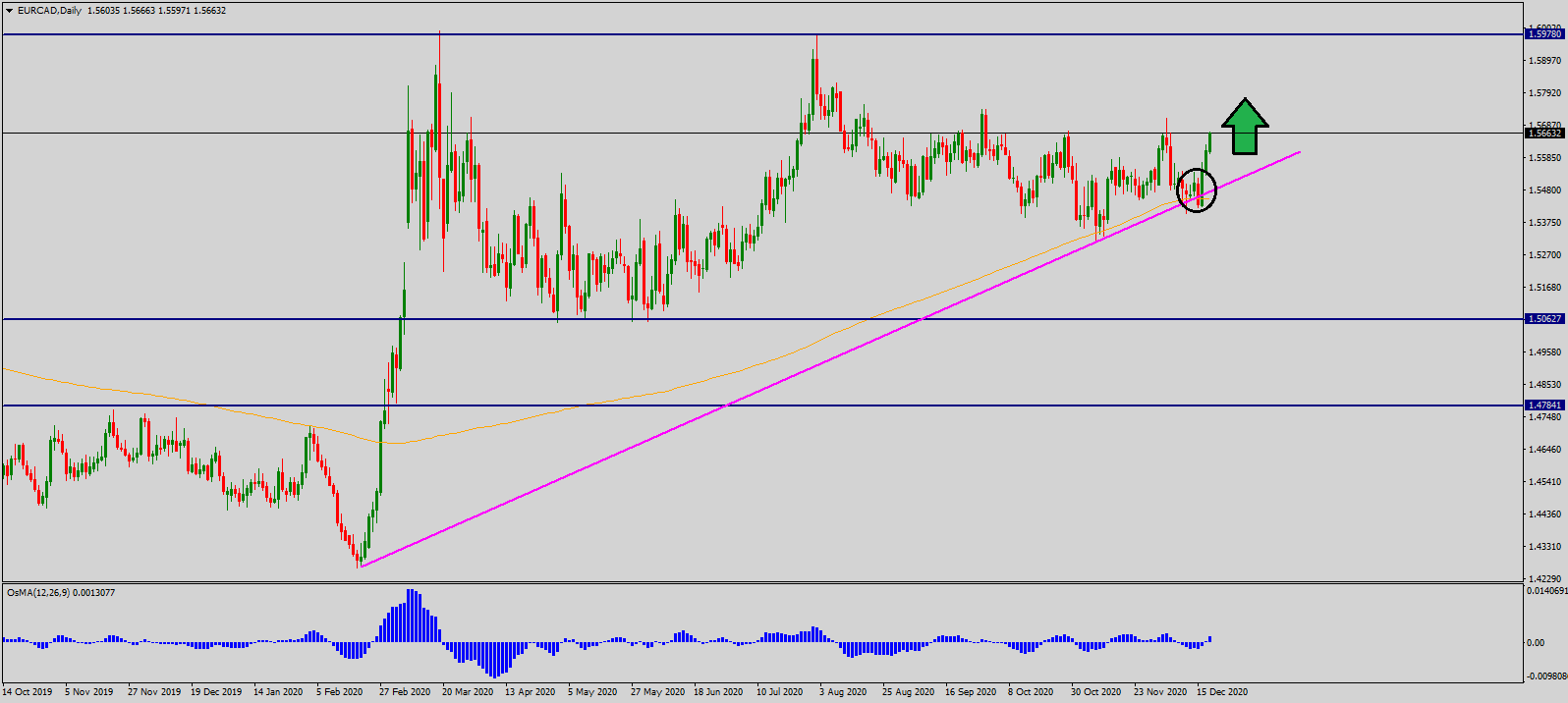 EUR/CAD je v podstate celý tento rok v uptrende s nejakými stranovkami a ako môžete z grafu vidieť, formuje sa obrovská formácia trojuholník. Nedávno sa trh len odrazil od trendovej línie a vznikol tam jasný engulfing pattern a odraz od kĺzavého priemeru (SMA200). Tieto všetky opory naznačujú, že trh chce ísť ešte vyššie a to minimálne otestovať rezistenciu 1.597. Ak sa tento trojuholník potom potvrdí (pozrieme si ho z vyššieho timeframe), môže prísť naozaj veľký pohyb. Teraz je len potvrdený buy signál aj 3 silnými bullish sviečkami, takže najbližší target nám dáva potenciál na zisk aspoň 300 pipov.