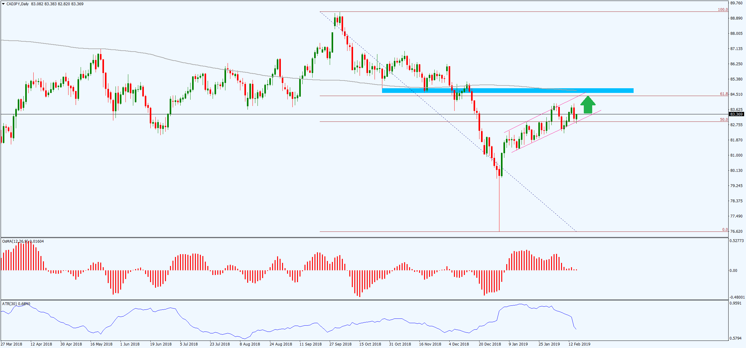 Koncom roka 2018 zažil CAD/JPY jeden z najsilnejších poklesov za posledné mesiace a po vyvrcholení zvanom flash crash prišiel stabilný rast. Bude naďalej pokračovať? Terajší rast bol nachvíľu pozastavený Fibonacci 50, kde sa trh párkrát zastavil, no nakoniec prekonal tento level a momentálne sa trh odráža od spodne línie trendového kanála a Fibo 50. Kým sa CAD/JPY nedostane z trendového kanála, tak by som očakával iba rast a najbližší target na Fibo 61.8, kde je takisto rezistencia a to je potenciál 120-150 pipov.