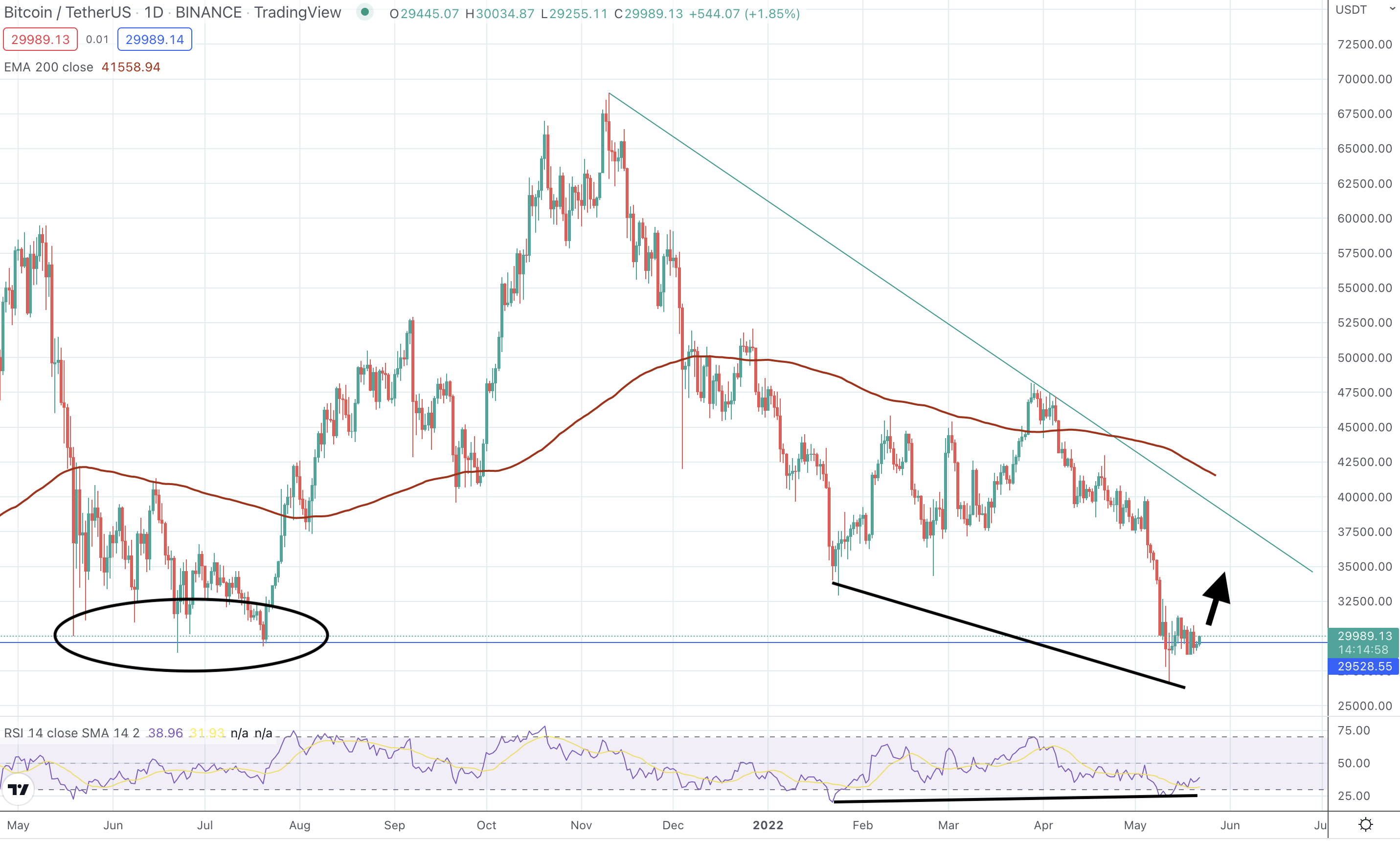 Bitcoin si prešiel za jeden mesiac drtivým poklesom zo 47k až na cca 27k, a to spôsobilo obrovský výplach na altcoinoch. Veľa traderov prišlo o veľké peniaze, no to môze byť práve teraz skvelá príležitosť. Bitcoin urobil falsebreak na dôležitom supporte a vznikla tam silná divergencia, a to sú dôvody prečo si myslím, že Bitcoin pôjde minimálne na 35-37K. Dočasná korekcia je nevyhnutná, ak toto nie je aj koniec celého downtrendu. Vysoká korelácia s americkými indexami vôbec nepomáha dlhodobému uptrendu na BTC, no aj napriek zlému sentimentu to vyzerá minimálne na dočasný odraz nahor aj o 20%.