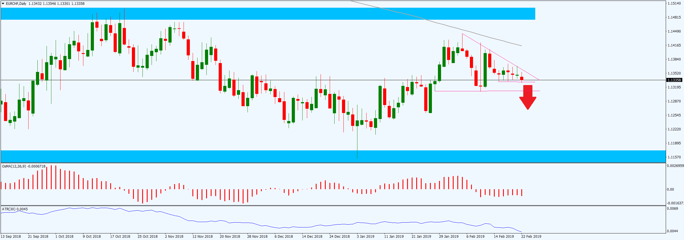 EUR/CHF je v downtrende už od mája 2018 a vyzerá to tak, že len tak neskončí, pretože sa tvorí short signál. Čakal som, že trh aspoň dotiahne rezistenciu (modrá línia), no eurofrank sa nechce dostať nad kĺzavý priemer (SMA200) a posledné dni vznikla nudná stranovka. Čo ďalej? V grafe vidno peknú formáciu v tvare trojuholníku, takže pri breaku neckline (support trojuholníku) by som očakával ďalší pokles k dôležitému supportu (vyznačená modrá línia), poprípade jeho break. Pretože eurové páry stále nemajú dotiahnuté gapy z roku 2017 a EUR/CHF má k tomu zo všetkých párov asi najďalej (vyše 650 pips).
