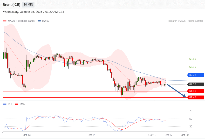 Komentář: Dokud se ropa Brent bude obchodovat pod rezistencí 62,70, tak je pravděpodobný pohyb do strany s mírnou medvědí tendencí.