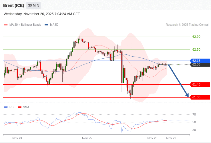 Komentář: Dokud se ropa Brent bude obchodovat pod rezistencí 62,15, tak je pravděpodobný pohyb do strany s mírnou medvědí tendencí.