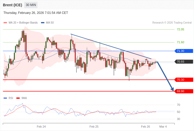 Preferovaný scénář: Krátké (short) pozice pod 71,30 s cílem na 70,30 a dále pak až na 69,90.