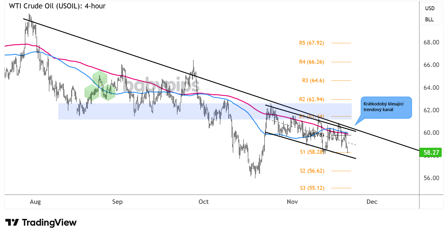 Ropa WTI (USOIL) se na 4hodinovém grafu obchoduje v krátkodobém klesajícím trendovém kanálu a nyní se přiblížila k jeho supportu kolem psychologické hladiny 58,00 USD. Najdou kolem současných úrovní znovu sílu býci a dočkáme se posílení a otestování rezistence kanálu, kde by se ke slovu mohli dostat opět medvědi?