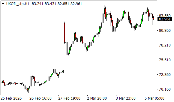 Vývoj ceny ropy Brent (1hodinový graf - H1):
