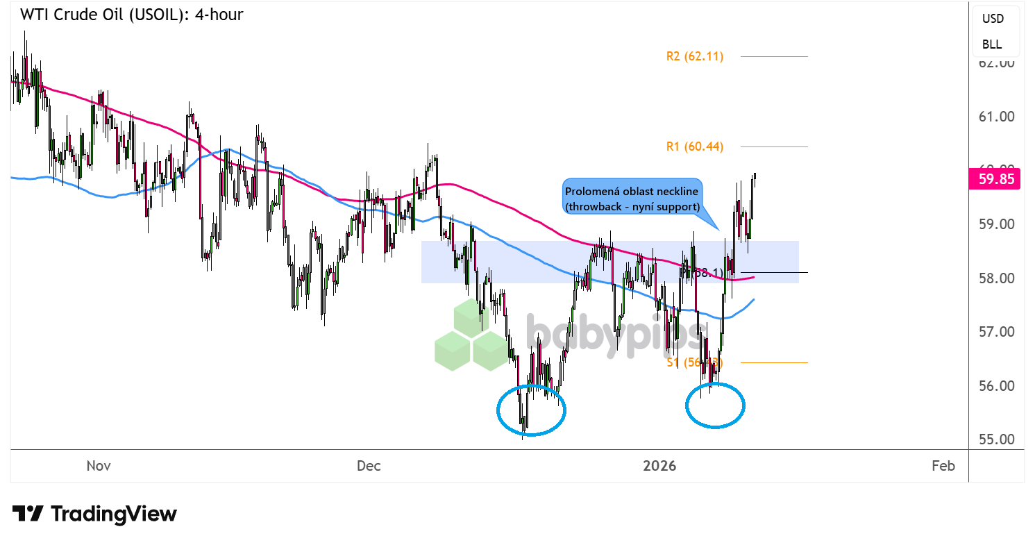 Vývoj ceny ropy WTI (4hodinový graf – H4):