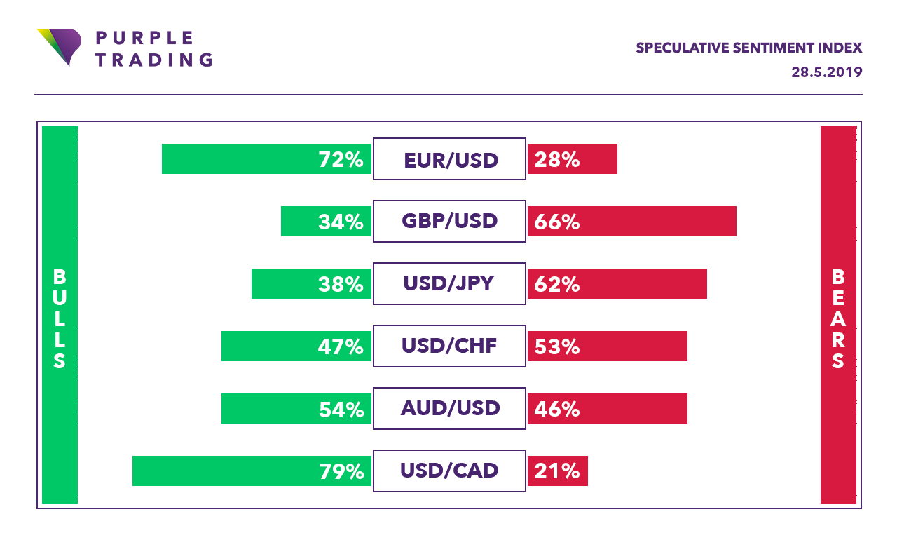 Níže uvedené hodnoty jsou přehledem spekulativního sentimentu traderů obchodujících v Purple Trading, tedy poměru otevřených pozic na jednotlivých instrumentech. Obchodníci v Purple Trading jsou do velké míry tzv. kvalifikovaní investoři, více informací naleznete ZDE.