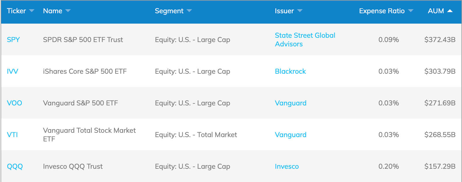 Pro příklad uvádíme tabulku s pěti největšími ETF a možná si vzpomenete, že tuto tabulku jsme již uváděli ve 4. díle o aktivech pod správou. Ve sloupci „Expense Ratio“ je uvedená procentní výše poplatků u daného ETF. Jak je vidět, ETFs s největším objemem aktiv pod správou (sloupec AUM) patří zároveň k těm s nejnižšími poplatky, ty se pohybují od 0,03 % do 0,20 %.