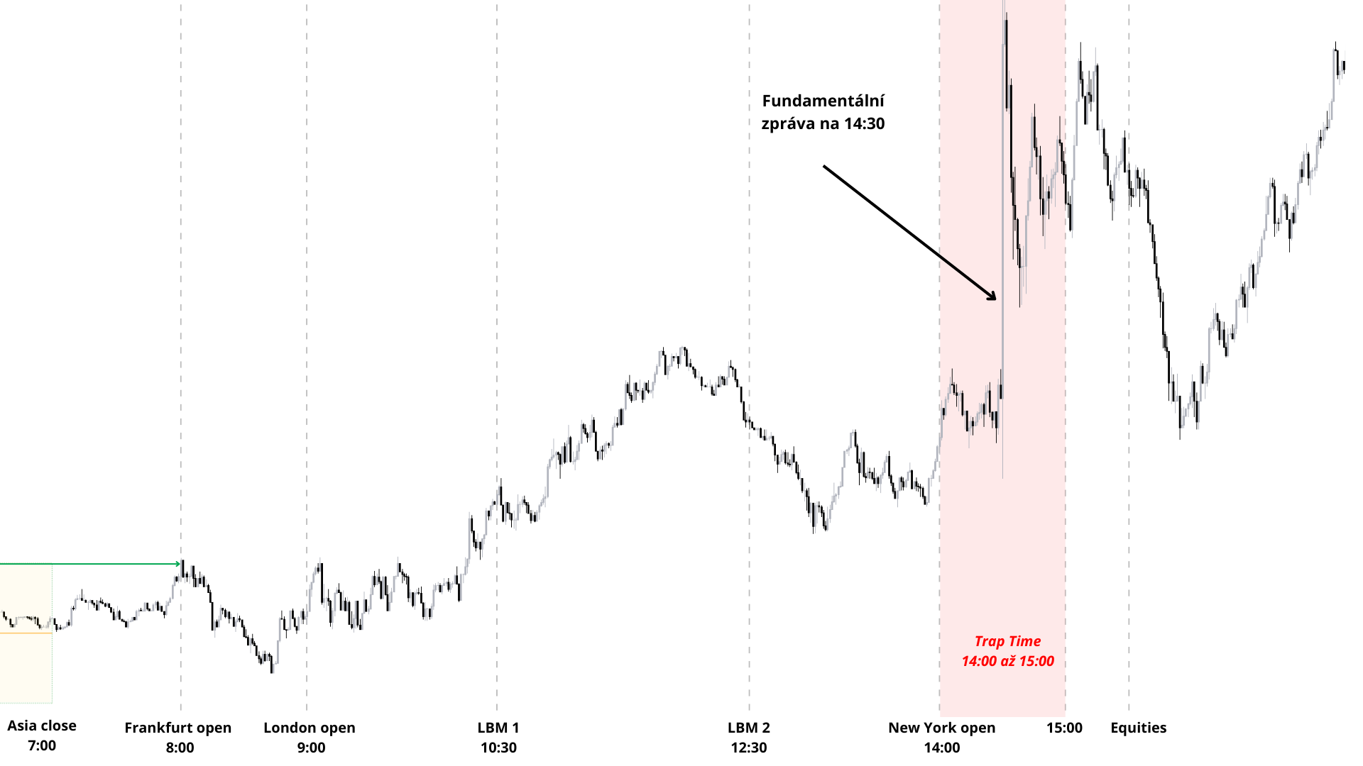 Jak vidíme na grafu výše, tak skončila Asie v 7:00 ráno, následně zde máme hodinovou mezeru, po tuto dobu stále analyzujeme situaci a neobchodujeme. S příchodem 8:00 se nám dostavil Frankfurt open a s tím i čekáme první větší pohyb dne, ten nastává po výběru Asia high (zelená šipka). Následně přichází London open s tím, že nastartoval směr do longu. V 10:30 přišla LBM 1 a po dvou hodinách LBM 2, vidíme, že nic závratného se v těchto dvou časech nestalo, což v tomto ukázkovém příkladu absolutně nevadí, protože s příchodem dalších konfluencí, které si budeme postupně přidávat, si budeme sestavovat celkový obraz o trhu. Po New York open v 14:00 přišel fundament právě na zmíněných 14:30, tento čas, jak jsme si řekli, od 14:00 do 15:00, je trap time, tedy se budeme snažit v tomto časovém okně neotevírat žádný obchod. Poslední důležitý čas je v době, kdy na trh vstupují instituce, nazýváme to Equities a jsou v čase 15:30, zde na příkladu můžeme vidět, že trh udělal další pohyb a znova se částečně rozpohyboval. Aktivita trhu končí většinou už po 17:00.