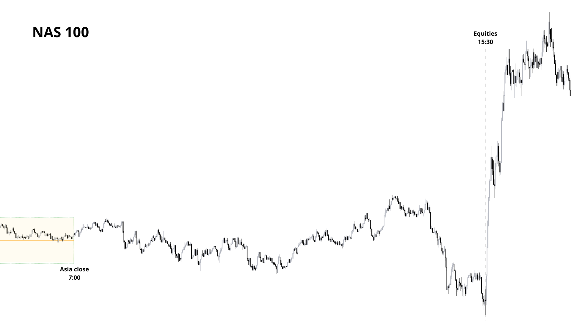 Na našem druhém příkladu výše můžeme vidět podobné situace, jakmile se uzavřela Asie v 7:00, tak máme zase hodinovou časovou rezervu na analýzu trhu, v 8:00 se otevírá Frankfurt a vidíme, že se znova potvrdil výběr Asijského high a v 9:00 na London open se tento směr potvrdil a nastal ještě silnější pohyb. V době LBM 1 vidíme, že se trh zpomalil a šel spíše do strany, jak jsme si řekli, tak obě LBM můžeme brát v rozmezí 10 minut před a 10 minut po. To samé se stalo v období LBM 2, kdy trh znova zpomalil, a dokonce v tomto okamžiku skončil i pullback a po 12:40 se znova nastartoval pohyb do shortu. New York open nepřinesl žádné výrazné pohyby, každopádně z pohledu likvidity konceptů byste zde za normálních okolností dostali stop-loss (proč si vysvětlíme v dalších článcích), každopádně pravidlo neobchodovat v trap timu by vás od tohoto obchodu odradilo. Equities zde naopak neudělali příliš významný pohyb, každopádně to nám nijak nevadí, jelikož naše obchody by měly být převážně v dopolední fázi trhu, naopak, pokud se rozhodnete obchodovat indexy tak vaše obchodní hodiny by měly začínat právě před 15:30, můžeme se podívat například na index NAS100 (NASDAQ) na následujícím obrázku.