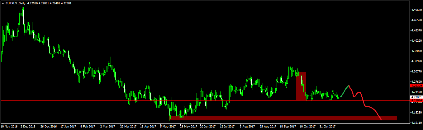 Na EUR/PLN môžeme vidieť, že začiatkom roka 2017 začal downtrend a od začiatku leta prišla mierna korekcia, no nie na dlho. Momentálne sa trh nachádza v stranovke už vyše mesiac a pred stranovkou som vyznačil v obdĺžniku silný pohyb nadol ktorý si myslím že bude pokračovať. Najlepšie by bolo, ak by sa trh ešte vrátil na rezist 4,263 a tam by sa dalo ísť sell so stoplossom nad, no ak sa nepodarí, tak by sa to takisto dalo zobchodovať breakoutom stranovky a s profit targetom až ku supportu okolo 4,16.