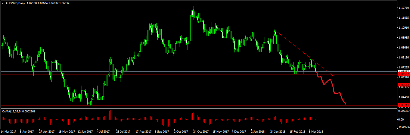 Odkedy vystrelil AUD/NZD nahor počas novozélandských volieb, tak začal downtrend, ktorý nevyzerá, že len tak skončí. Po silnom poklese môžeme vidieť ako trh stagnuje už niekoľko týždňov a teraz nám trh značí, že je pripravený breaknúť support a pokračovať nižšie. Ak sa pozorne pozriete na posledné daily sviečky, tak vidno ako každý pokus o rast bol odmietnutý a trh sa tlačí dole. Takisto bol niekoľkokrát testnutý support 1.0658 a teraz pôjde trh pod neho. Najbližší level je iba 100pips nižšie, no myslím si, že trh pôjde až dole na w1 support, no AUD/NZD je jeden z najnepredvídatelnejších trhov, takže treba brať čo je na stole.