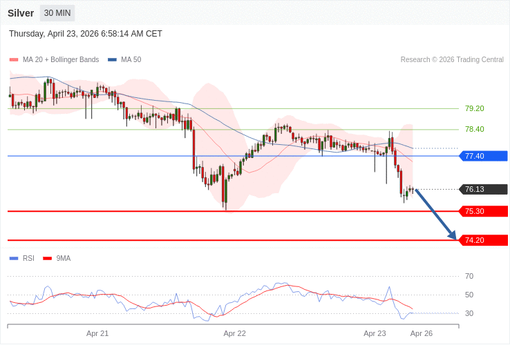 Klíčová slova: Intradenní výhled | Stříbro | Pozice | Rezistence | Short | Trading | Pivot | Trading Central | Supporty a rezistence | Výhled | Krátké (short) pozice | Pokles | Růst | Průraz | Supporty |