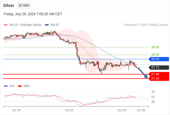 Komentář: Dokud se stříbro bude obchodovat pod rezistencí 28,10, tak je pravděpodobný pohyb do strany s mírnou medvědí tendencí.