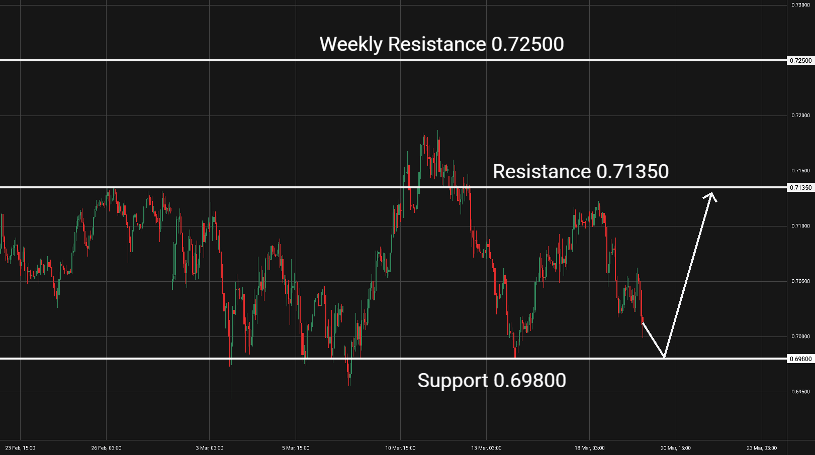 AUD/USD: Tento měnový pár je na 1hodinovém grafu v klesajícím trendu několik hodin. Support je na hladině 0,6980. V případě odrazu od supportu bychom mohli uvažovat o long pozici s cílem u nejbližší rezistence. V případě jasného proražení supportu bychom mohli uvažovat o short pozici. Rezistence je na hladině 0,7135 a 0,7250. Blížící se fundamentální zprávy by neměly ovlivnit vývoj tohoto měnového páru.
